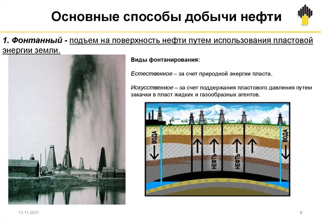 Основные способы добычи нефти1. Фонтанный - подъем на поверхность нефти путем использования пластовой