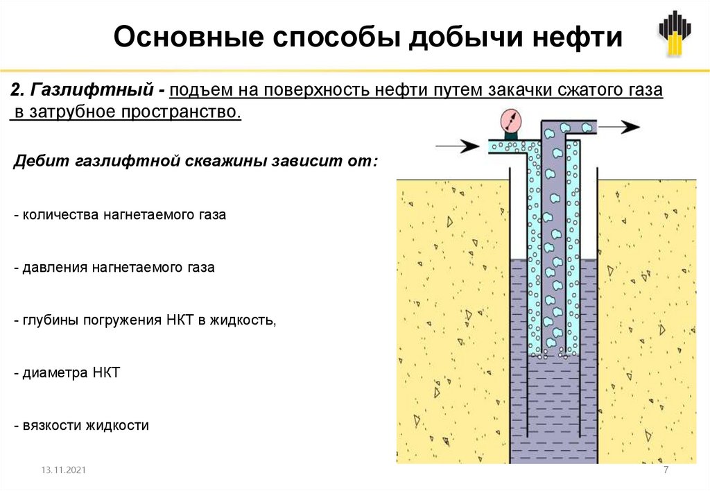 Основные способы добычи нефти2. Газлифтный - подъем на поверхность нефти путем закачки сжатого газа