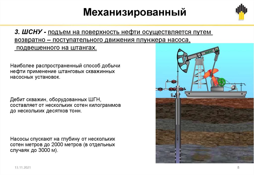 Механизированный3. ШСНУ - подъем на поверхность нефти осуществляется путем