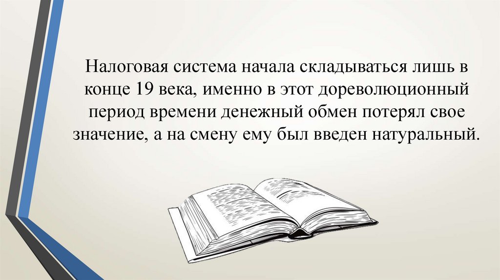 Налоговая система начала складываться лишь вконце 19 века, именно в этот дореволюционный
