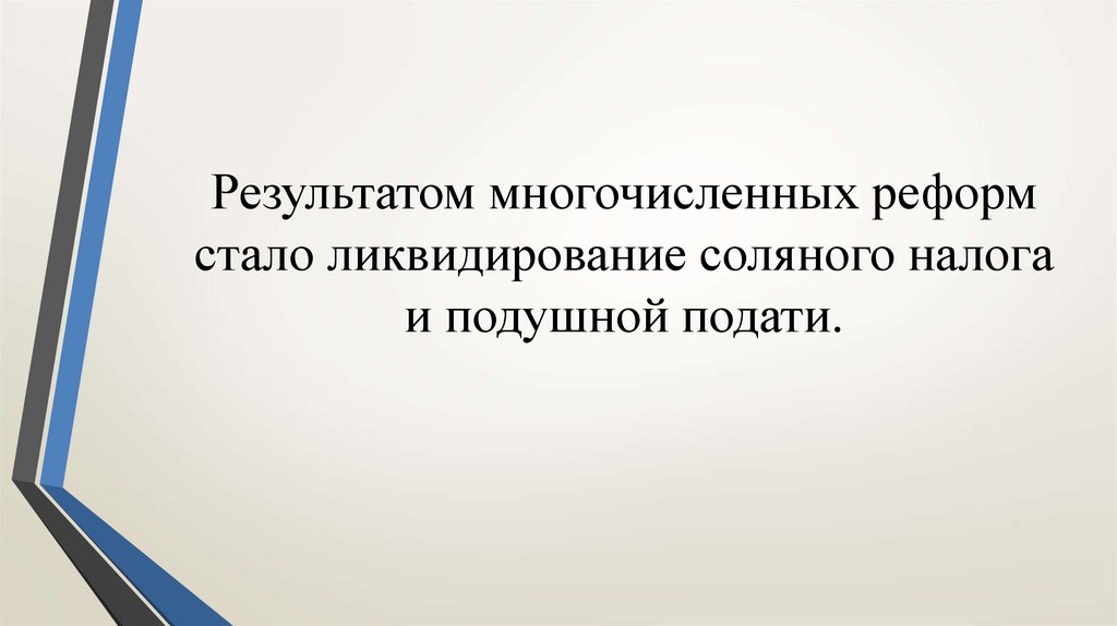 Результатом многочисленных реформстало ликвидирование соляного налога