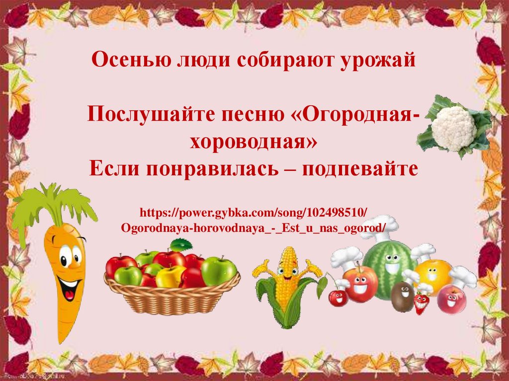 Осенью люди собирают урожайПослушайте песню «Огороднаяхороводная»