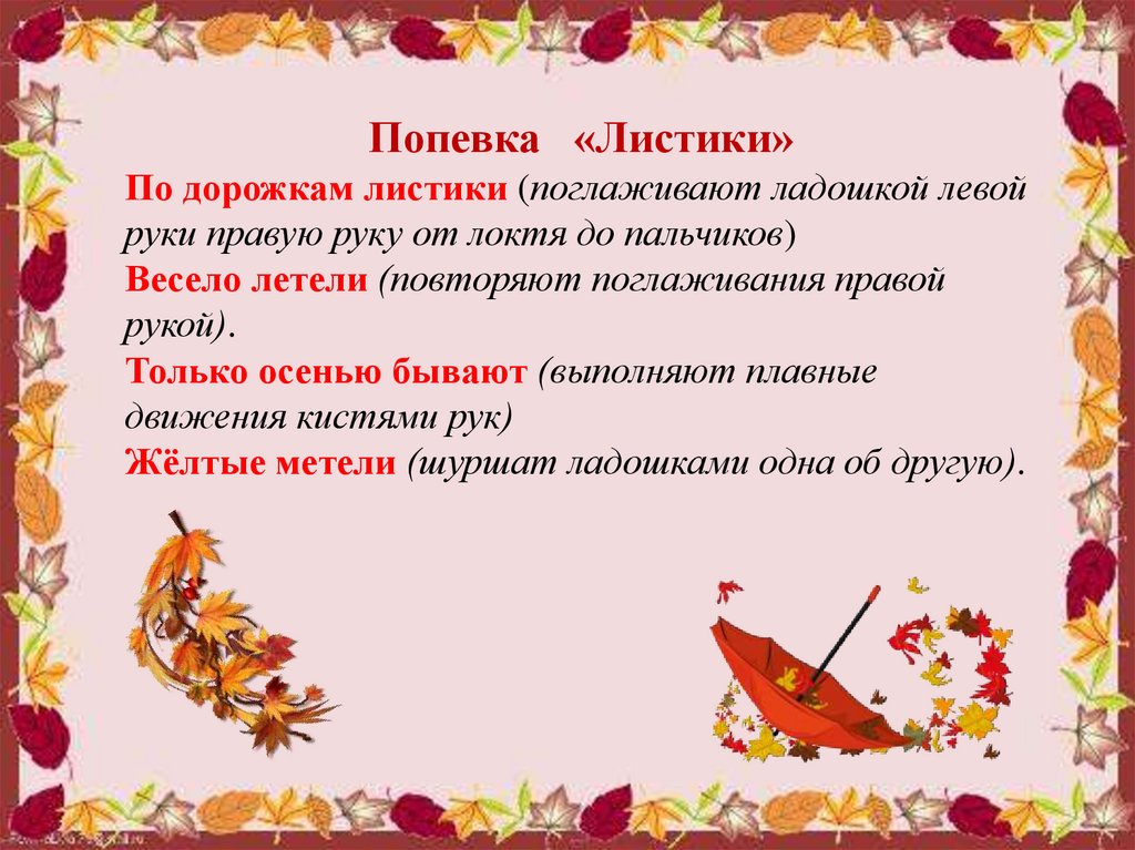 Попевка «Листики»По дорожкам листики (поглаживают ладошкой левой