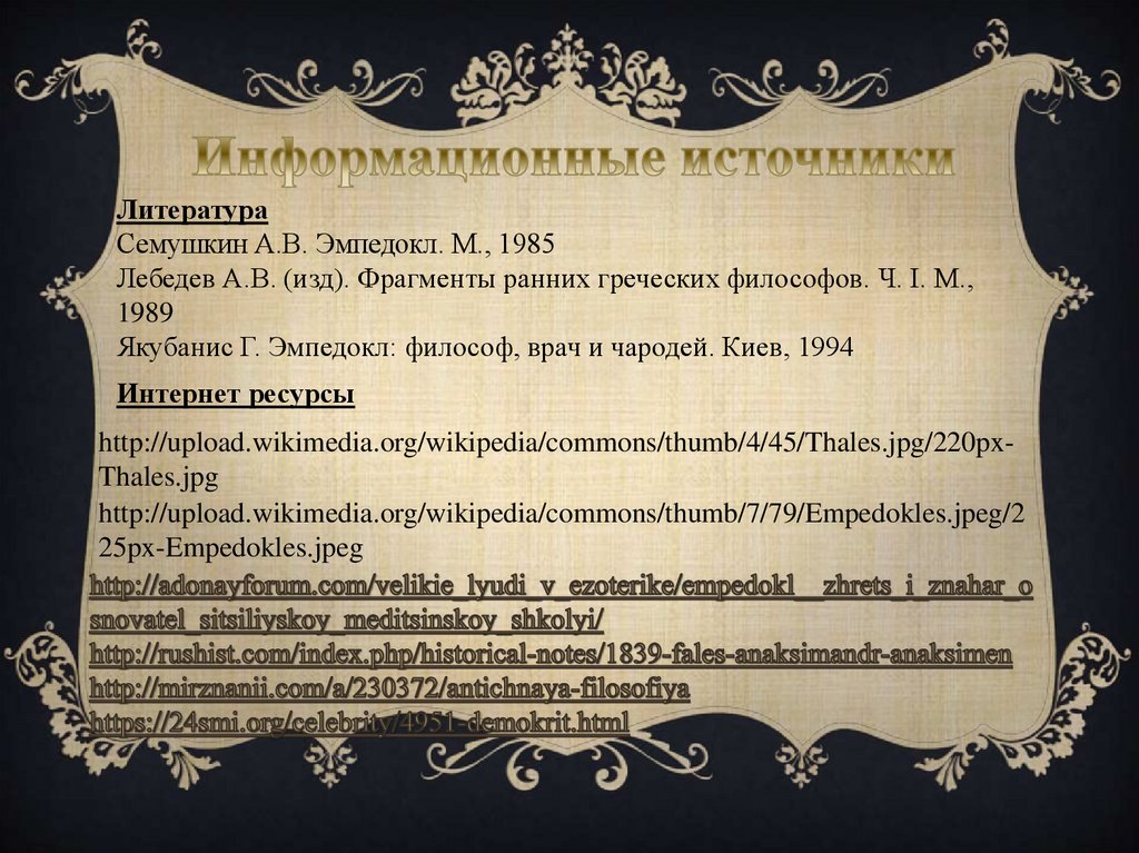 ЛитератураСемушкин А.В. Эмпедокл. М., 1985