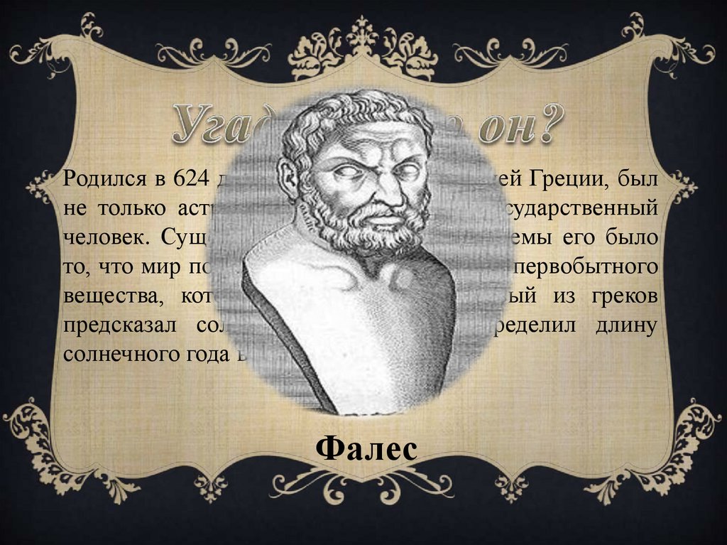 Родился в 624 до Р. Х. в г. Милете древней Греции, былне только астроном и философ, но и государственный