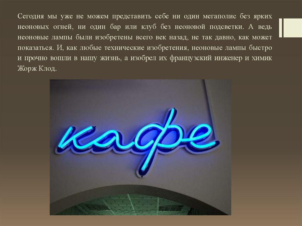 Сегодня мы уже не можем представить себе ни один мегаполис без яркихнеоновых огней, ни один бар или клуб без неоновой подсветки. А ведь