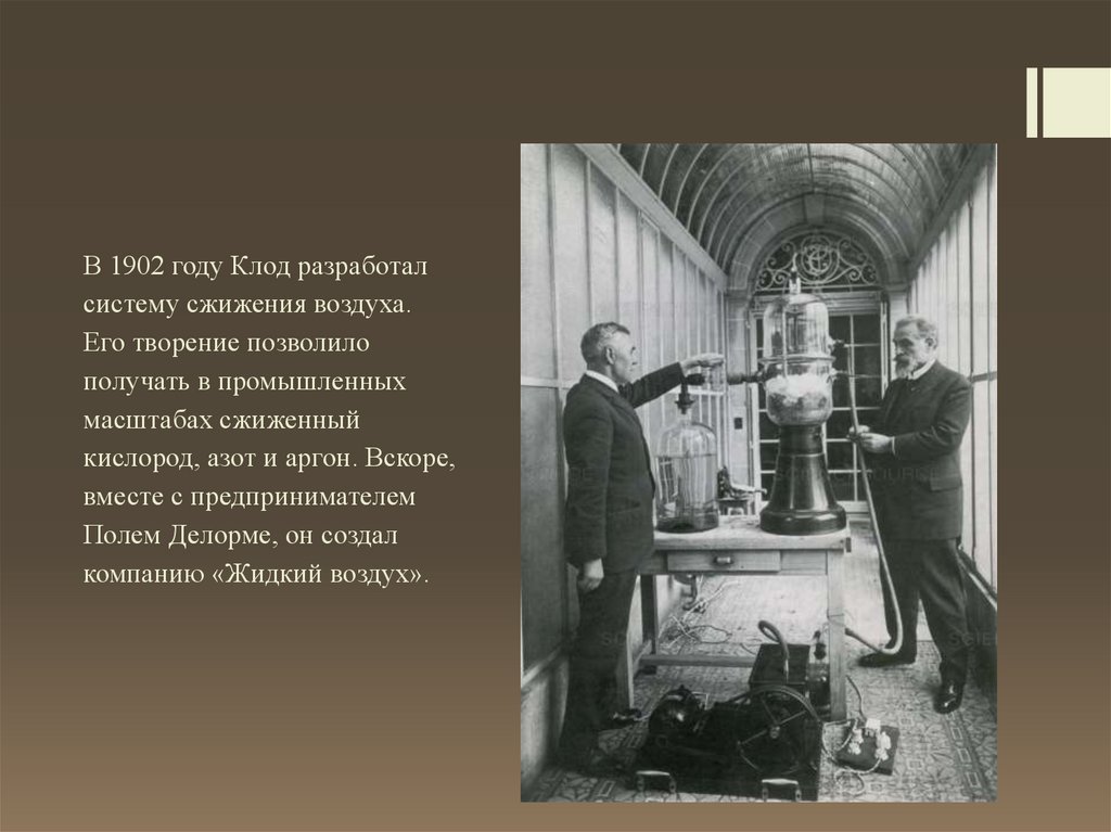 В 1902 году Клод разработалсистему сжижения воздуха.