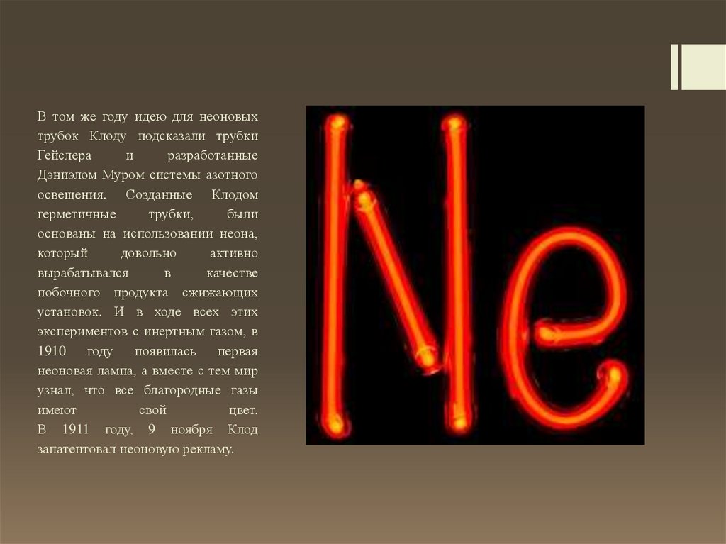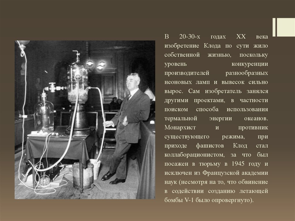 В том же году идею для неоновыхтрубок Клоду подсказали трубки