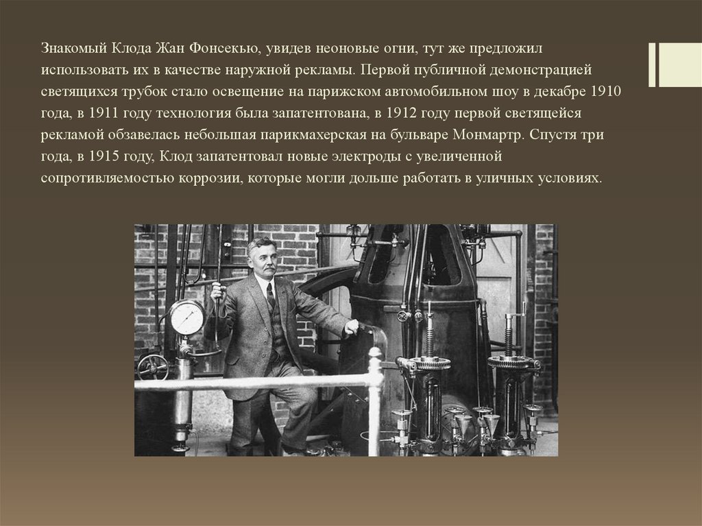 Знакомый Клода Жан Фонсекью, увидев неоновые огни, тут же предложилиспользовать их в качестве наружной рекламы. Первой публичной демонстрацией