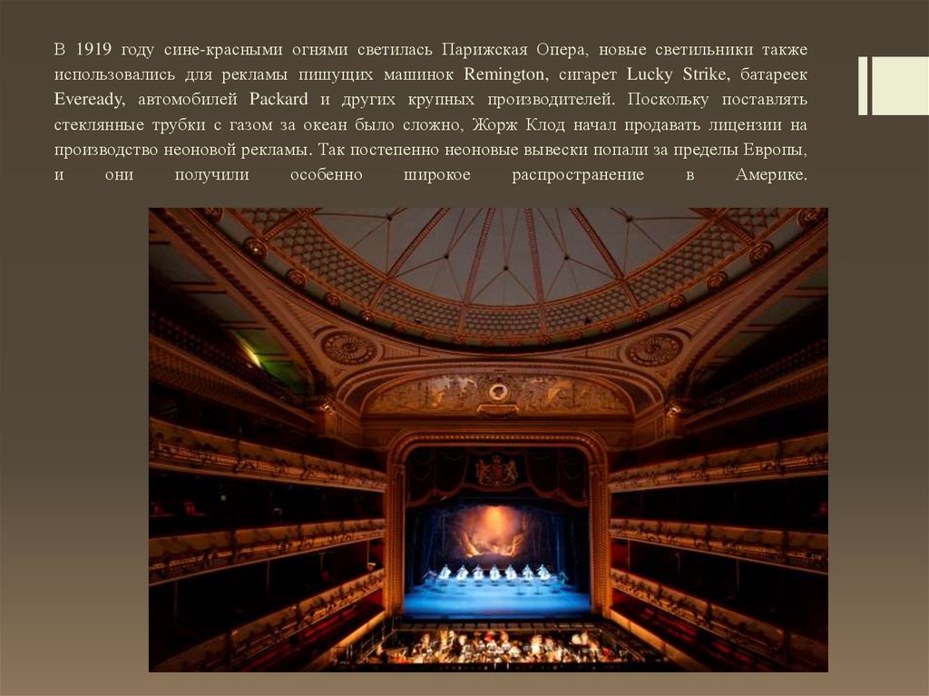 В 1919 году сине-красными огнями светилась Парижская Опера, новые светильники такжеиспользовались для рекламы пишущих машинок Remington, сигарет Lucky Strike, батареек