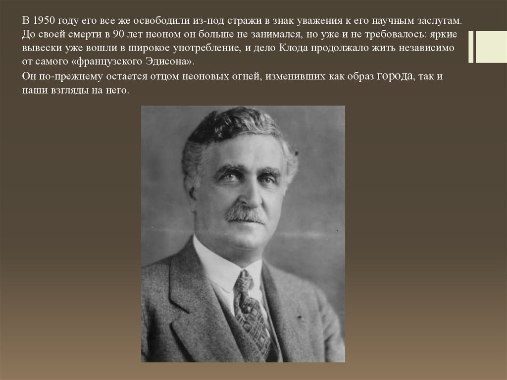 В 1950 году его все же освободили из-под стражи в знак уважения к его научным заслугам.До своей смерти в 90 лет неоном он больше не занимался, но уже и не требовалось: яркие