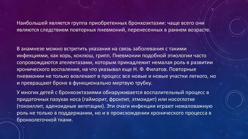 Наибольшей является группа приобретенных бронхоэктазии: чаще всего ониявляются следствием повторных пневмоний, перенесенных в раннем возрасте.