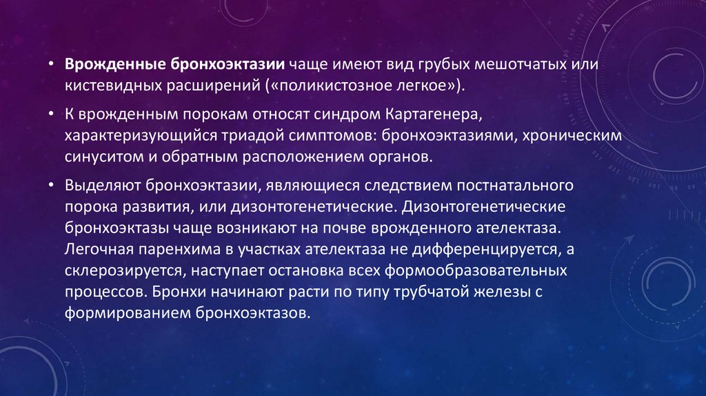 КЛАССИФИКАЦИЯ БРОНХОЭКТАЗИИ:• 1) по генезу: приобретенные, дизонтогенетические, врожденные;
