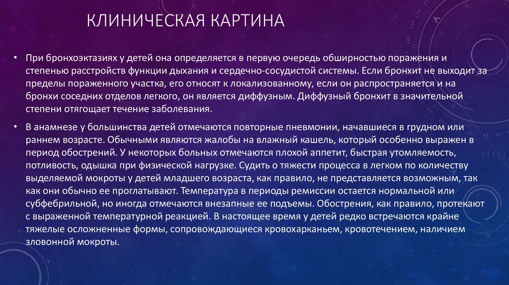 раннем возрасте. Обычными являются жалобы на влажный кашель, который особенно выражен в