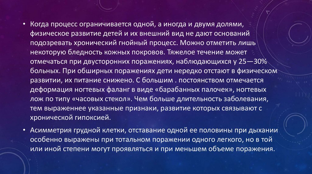 • В анамнезе у большинства детей отмечаются повторные пневмонии, начавшиеся в грудном или