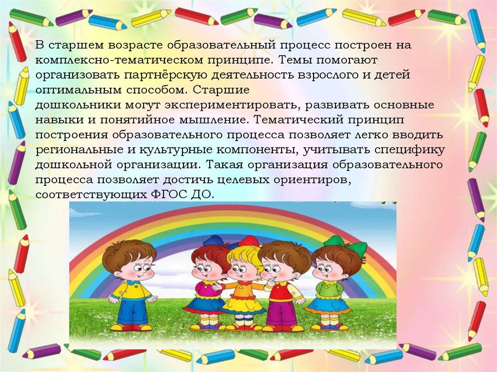 В старшем возрасте образовательный процесс построен накомплексно-тематическом принципе. Темы помогают
