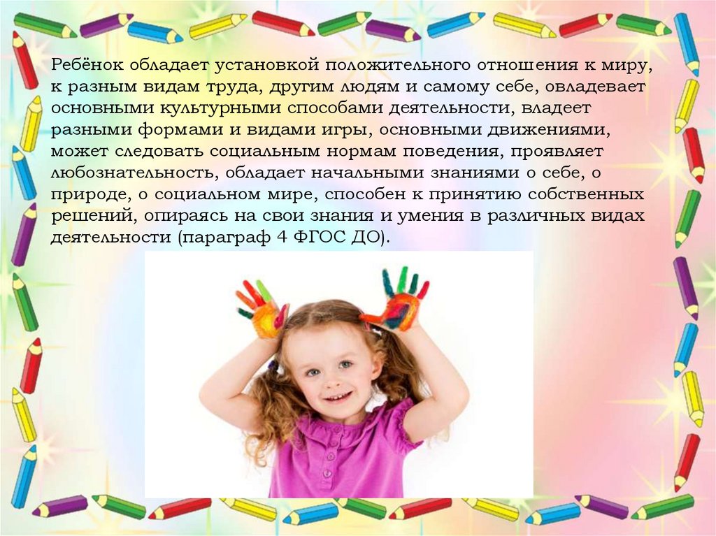 Ребёнок обладает установкой положительного отношения к миру,к разным видам труда, другим людям и самому себе, овладевает