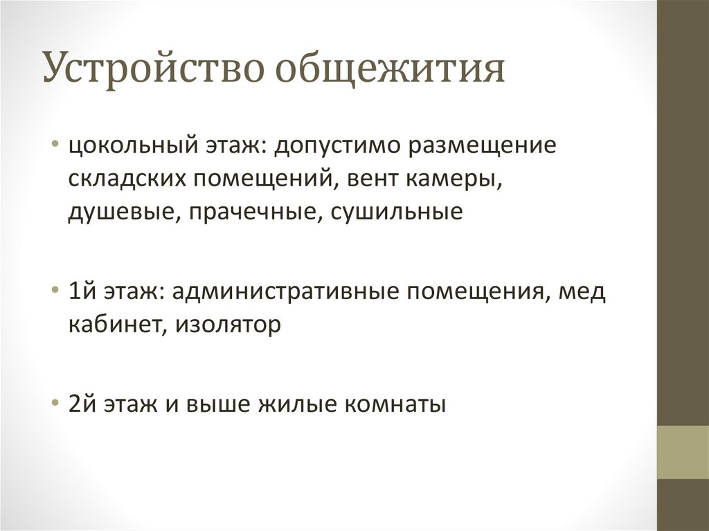 Устройство общежития• цокольный этаж: допустимо размещение