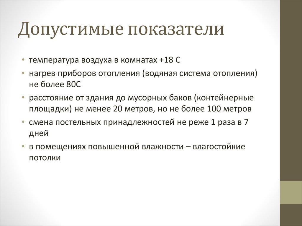 Допустимые показатели• температура воздуха в комнатах +18 С