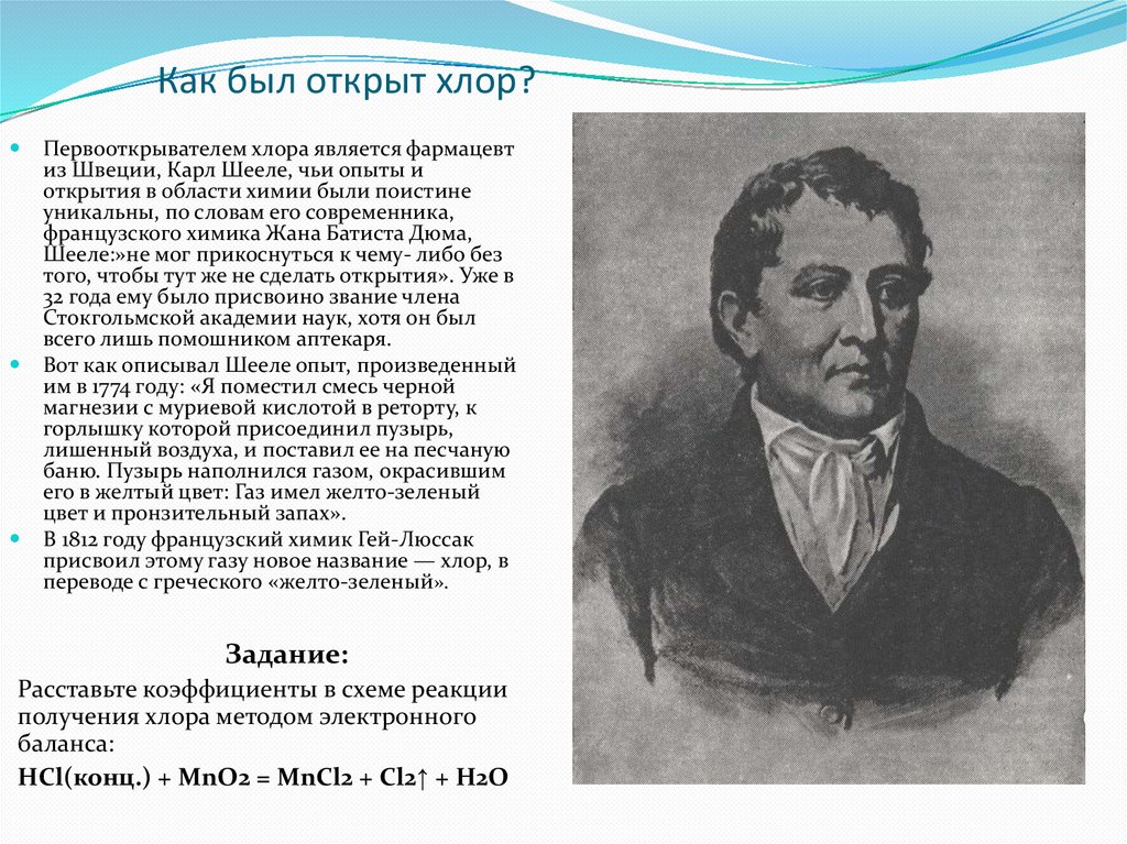 Как был открыт хлор?Первооткрывателем хлора является фармацевт