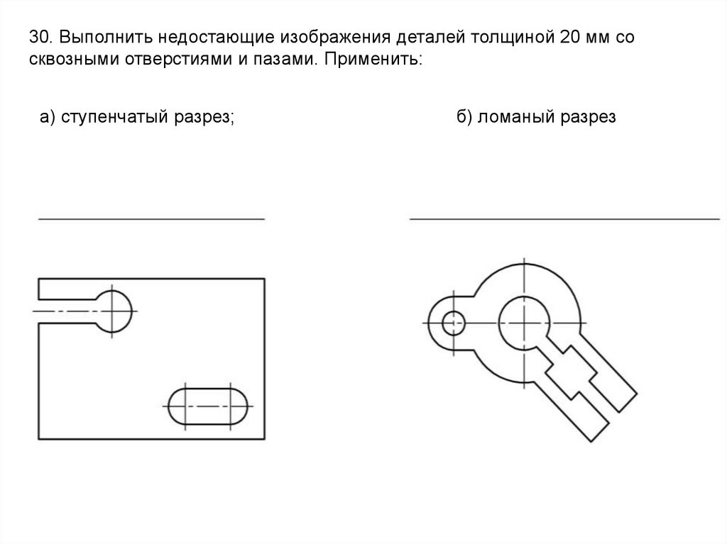 30. Выполнить недостающие изображения деталей толщиной 20 мм сосквозными отверстиями и пазами. Применить: