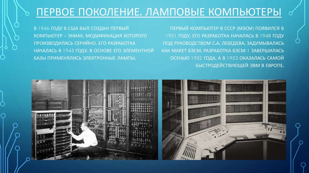 ПЕРВОЕ ПОКОЛЕНИЕ. ЛАМПОВЫЕ КОМПЬЮТЕРЫВ 1946 ГОДУ В США БЫЛ СОЗДАН ПЕРВЫЙ