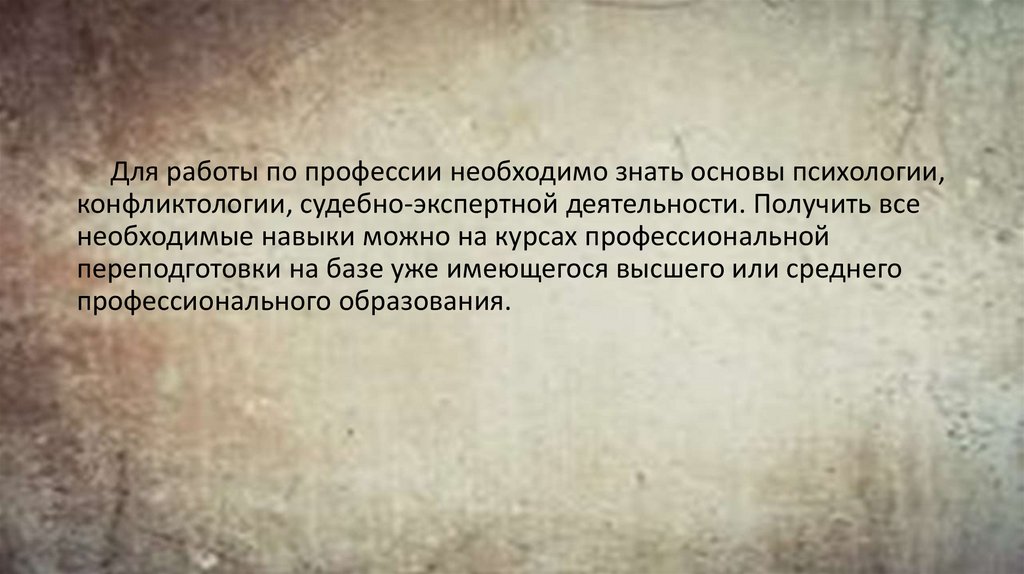 Для работы по профессии необходимо знать основы психологии,конфликтологии, судебно-экспертной деятельности. Получить все
