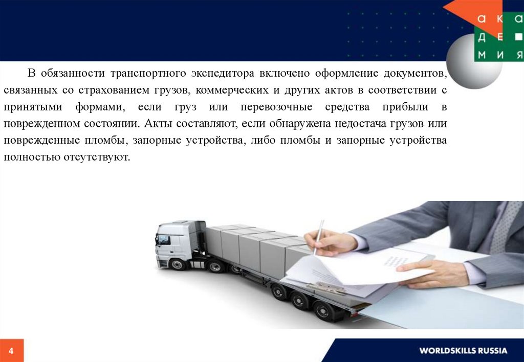 В обязанности транспортного экспедитора включено оформление документов,связанных со страхованием грузов, коммерческих и других актов в соответствии с