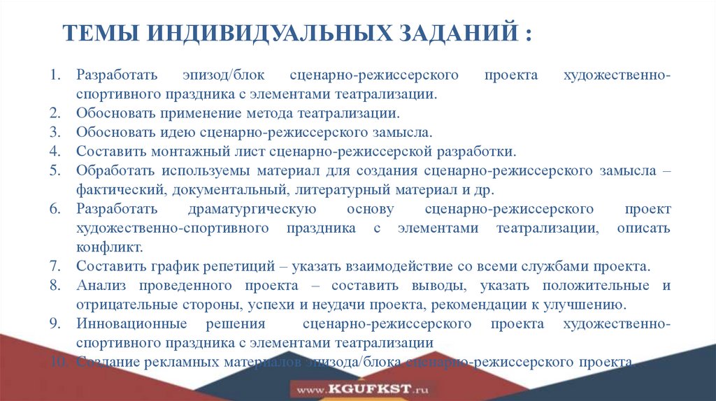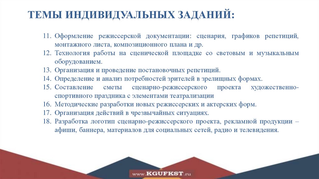 ТЕМЫ ИНДИВИДУАЛЬНЫХ ЗАДАНИЙ:11. Оформление режиссерской документации: сценария, графиков репетиций,