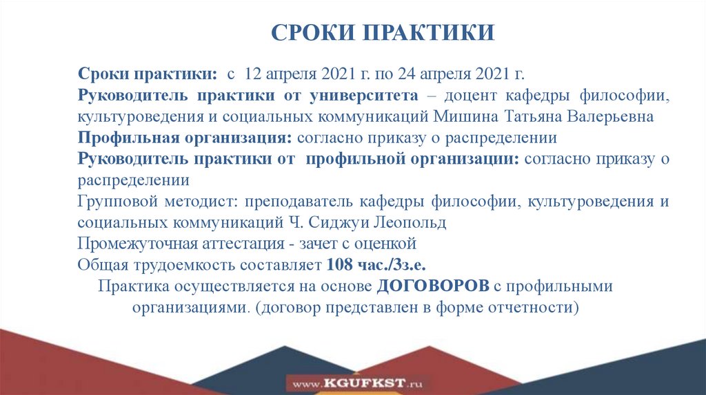 СРОКИ ПРАКТИКИСроки практики: с 12 апреля 2021 г. по 24 апреля 2021 г.