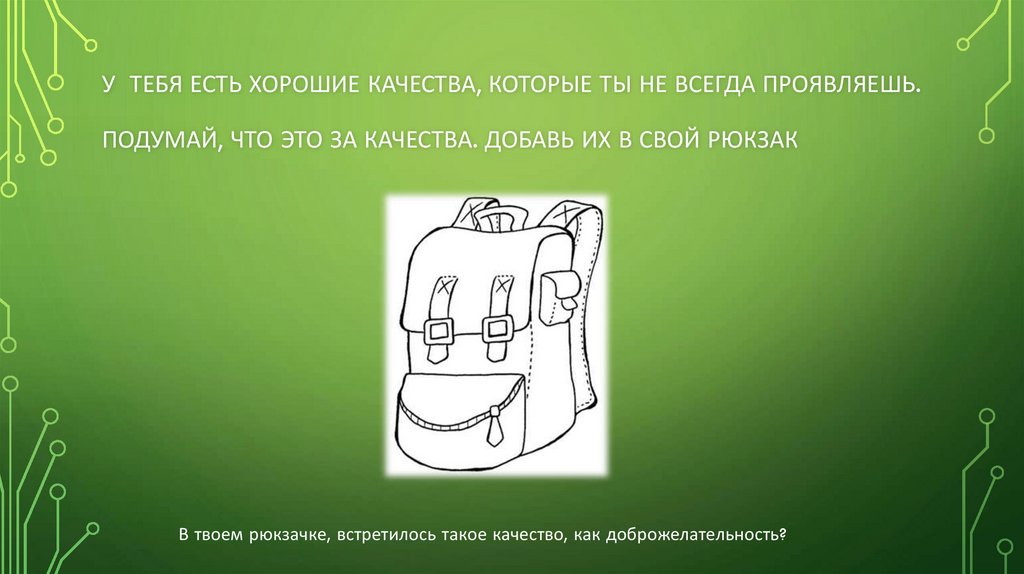 У ТЕБЯ ЕСТЬ ХОРОШИЕ КАЧЕСТВА, КОТОРЫЕ ТЫ НЕ ВСЕГДА ПРОЯВЛЯЕШЬ.ПОДУМАЙ, ЧТО ЭТО ЗА КАЧЕСТВА. ДОБАВЬ ИХ В СВОЙ РЮКЗАК