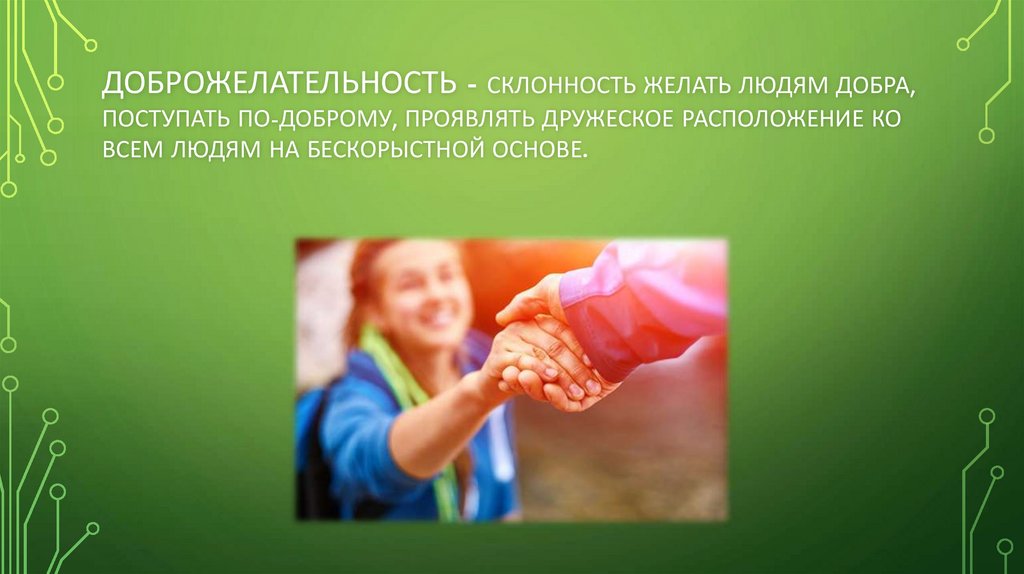 ДОБРОЖЕЛАТЕЛЬНОСТЬ - СКЛОННОСТЬ ЖЕЛАТЬ ЛЮДЯМ ДОБРА,ПОСТУПАТЬ ПО-ДОБРОМУ, ПРОЯВЛЯТЬ ДРУЖЕСКОЕ РАСПОЛОЖЕНИЕ КО