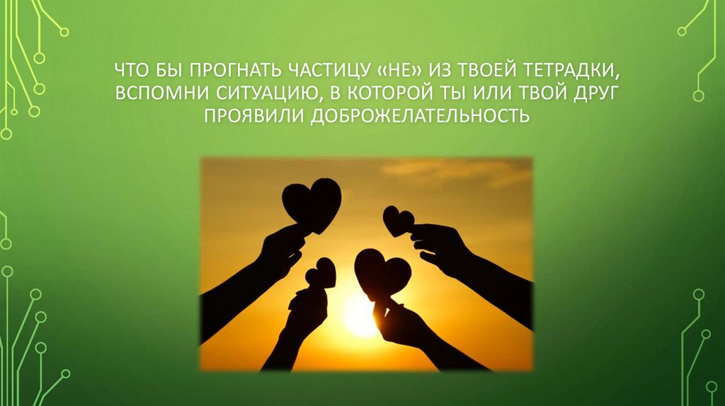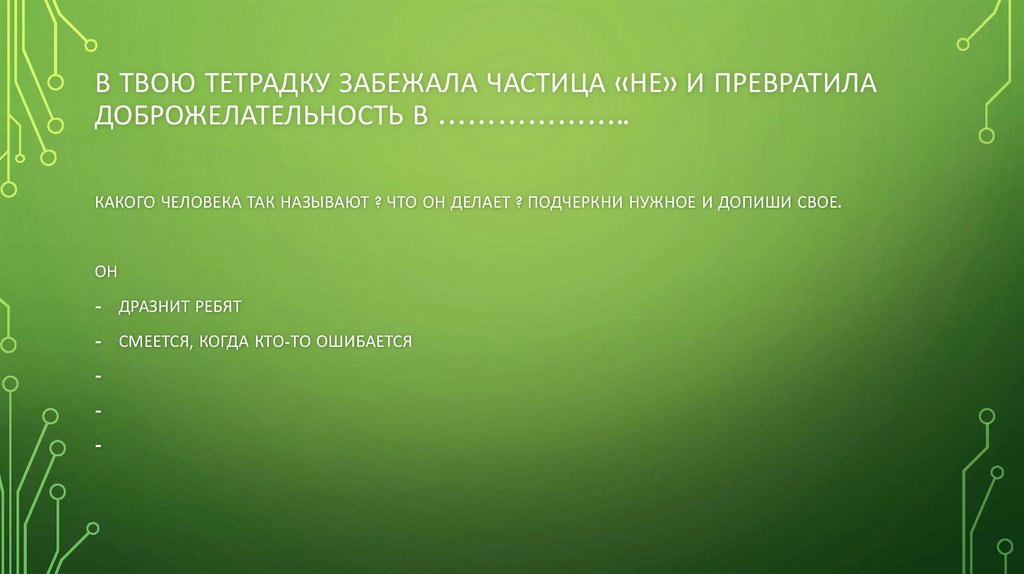 В ТВОЮ ТЕТРАДКУ ЗАБЕЖАЛА ЧАСТИЦА «НЕ» И ПРЕВРАТИЛАДОБРОЖЕЛАТЕЛЬНОСТЬ В ………………..