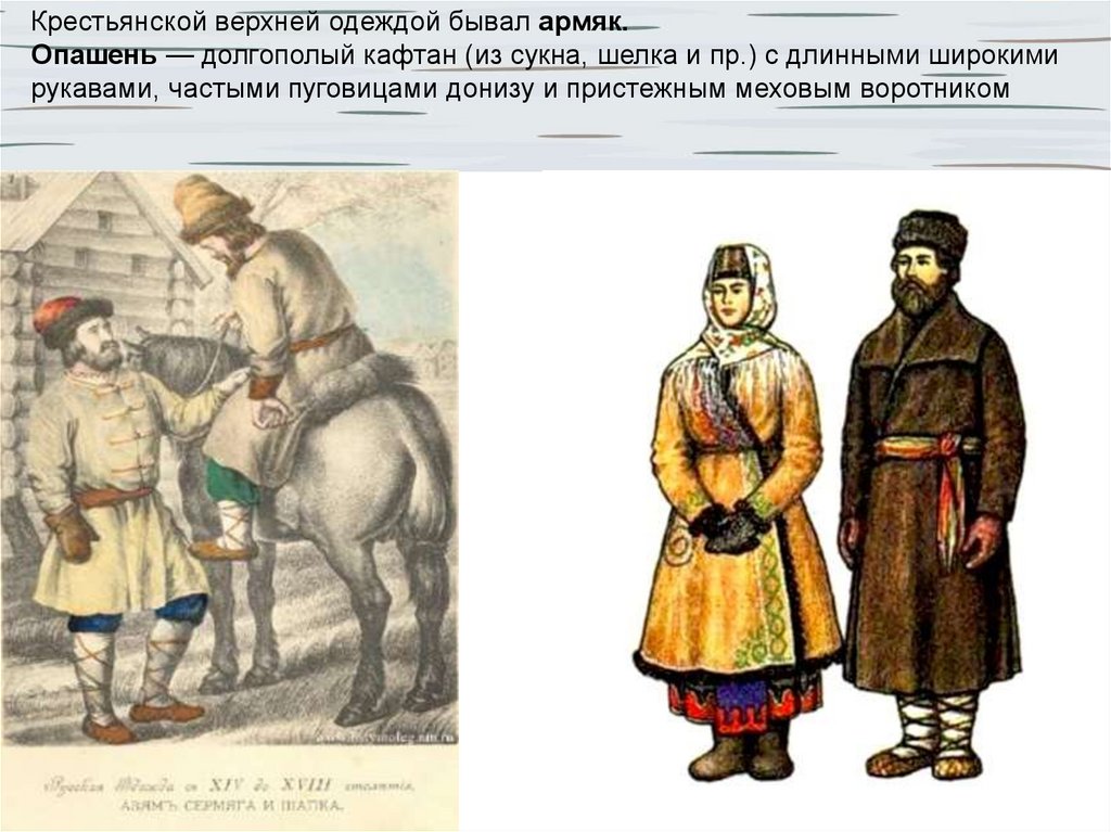 Крестьянской верхней одеждой бывал армяк.Опашень — долгополый кафтан (из сукна, шелка и пр.) с длинными широкими