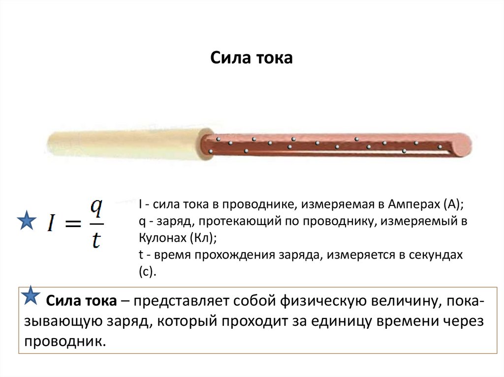 Сила тока – представляет собой физическую величину, показывающую заряд, который проходит за единицу времени через