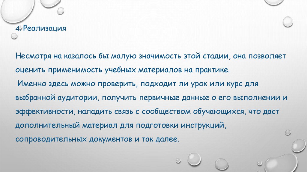 4. РеализацияНесмотря на казалось бы малую значимость этой стадии, она позволяет
