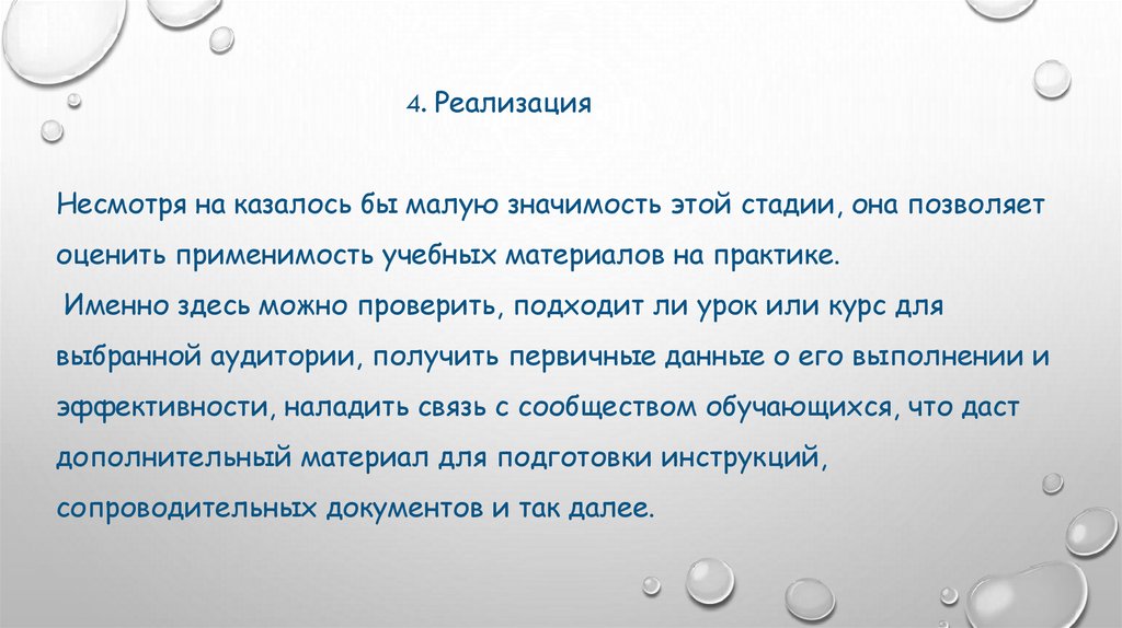 4. РеализацияНесмотря на казалось бы малую значимость этой стадии, она позволяет
