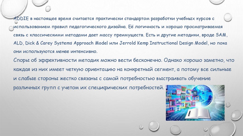 Хорошо освоенная и проработанная методика ADDIE даст мощныйинструментарий для создания универсальных обучающих курсов,