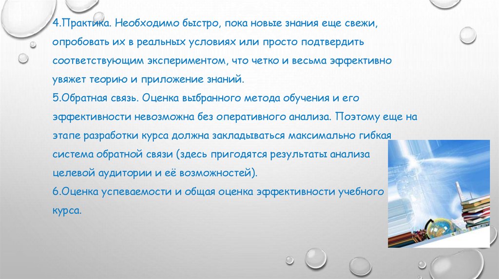 4.Практика. Необходимо быстро, пока новые знания еще свежи,опробовать их в реальных условиях или просто подтвердить