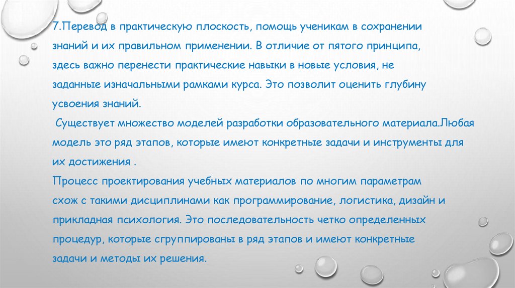 7.Перевод в практическую плоскость, помощь ученикам в сохранениизнаний и их правильном применении. В отличие от пятого принципа,