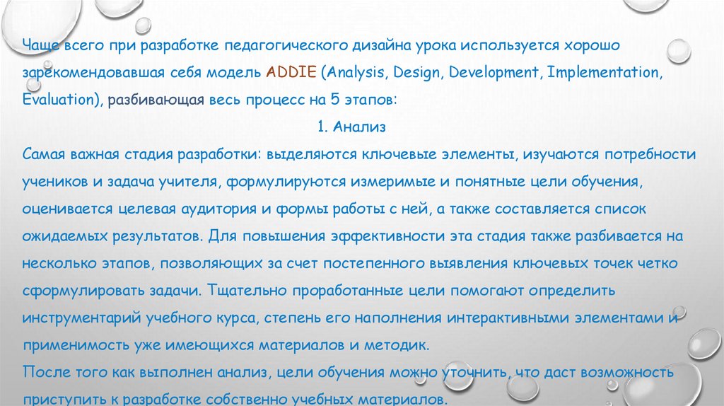 Чаще всего при разработке педагогического дизайна урока используется хорошозарекомендовавшая себя модель ADDIE (Analysis, Design, Development, Implementation,