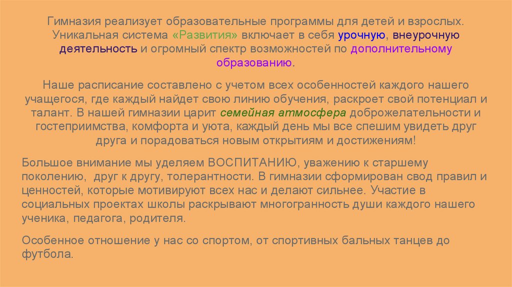 Гимназия реализует образовательные программы для детей и взрослых.Уникальная система «Развития» включает в себя урочную, внеурочную