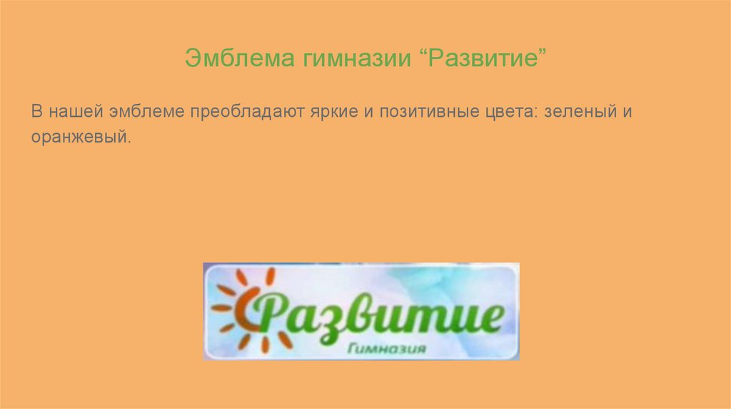 Эмблема гимназии “Развитие”В нашей эмблеме преобладают яркие и позитивные цвета: зеленый и