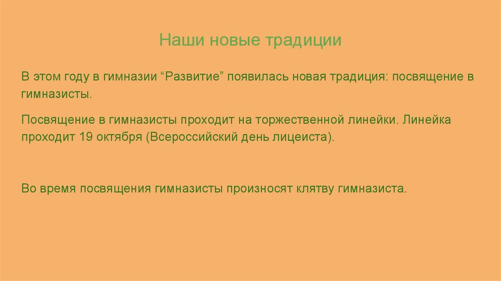 Наши новые традицииВ этом году в гимназии “Развитие” появилась новая традиция: посвящение в