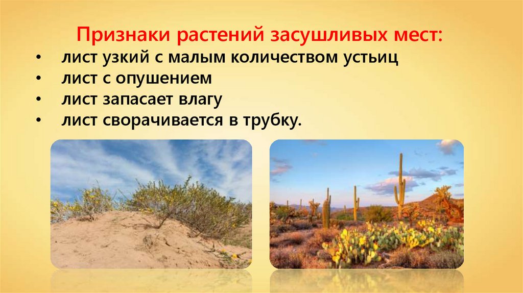 Признаки растений засушливых мест:лист узкий с малым количеством устьиц