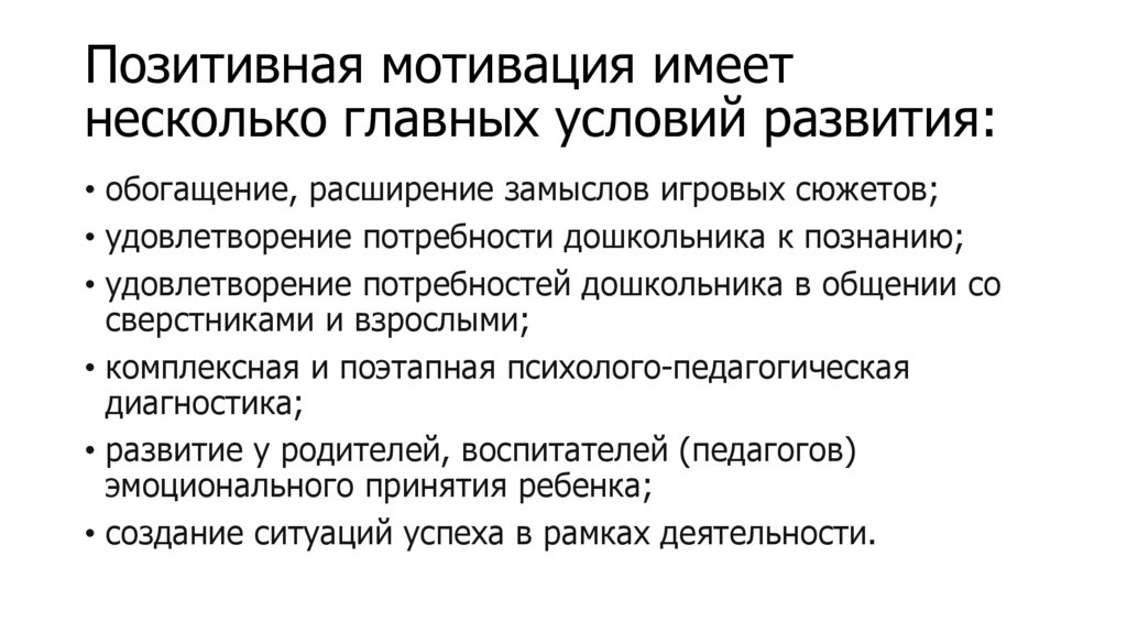 Позитивная мотивация имеетнесколько главных условий развития: