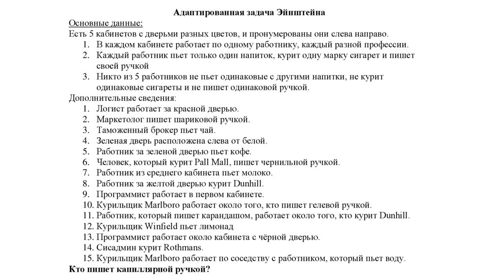 Адаптированная задача ЭйнштейнаОсновные данные: