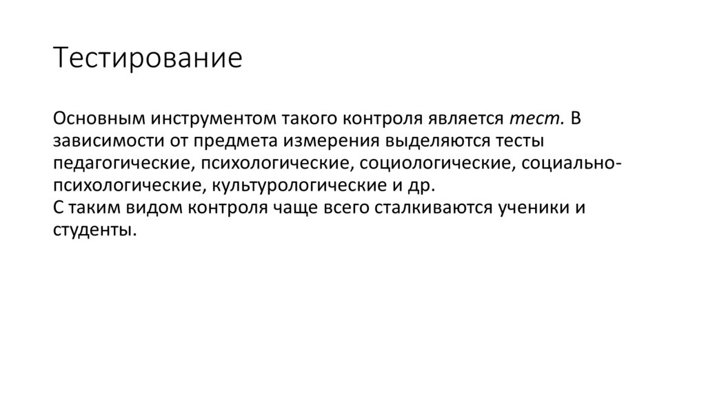 ТестированиеОсновным инструментом такого контроля является тест. В