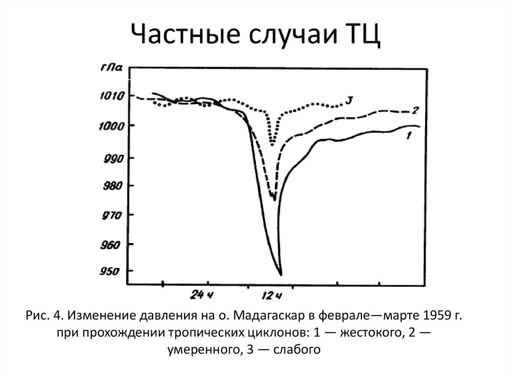 Рис. 4. Изменение давления на о. Мадагаскар в феврале—марте 1959 г.при прохождении тропических циклонов: 1 — жестокого, 2 —