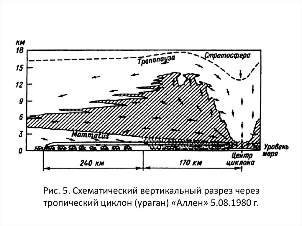 Рис. 5. Схематический вертикальный разрез черезтропический циклон (ураган) «Аллен» 5.08.1980 г.